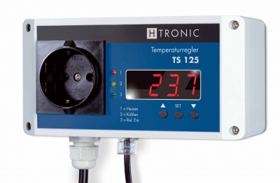 Der neue Temperaturschalter TSM 125 eignet sich hervorragend für alle Einsatzbereiche, bei denen eine Temperaturregelung im Heiz- oder Kühlbetrieb erforderlich ist. Sein externer, steckbarer Temperatursensor erfasst Messbereiche von -55 bis +125° Grad Celsius. Die Schalttemperatur wird in 1 Grad-Schritten eingestellt. Eine 12,7mm große 7-Segment-Anzeige zeigt die Ein- und Ausschaltemperatur bzw. auch die aktuelle Temperatur an. Eine rote LED signalisiert zudem „Heizen“, eine gelbe „Kühlen“, eine weitere leuchtet bei eingeschaltetem Relais. Das Elektronik-Thermostat ist nicht nur übersichtlich und einfach in der Handhabung, sondern auch sicher in der Anwendung. Fühlerkurzschluss und Fühlerunterbrechung werden sofort erkannt. Das Gerät kann eigenständig eingesetzt werden, aber auch als Ersatz für defekte mechanische Thermostate oder für Digitalthermometer dienen.